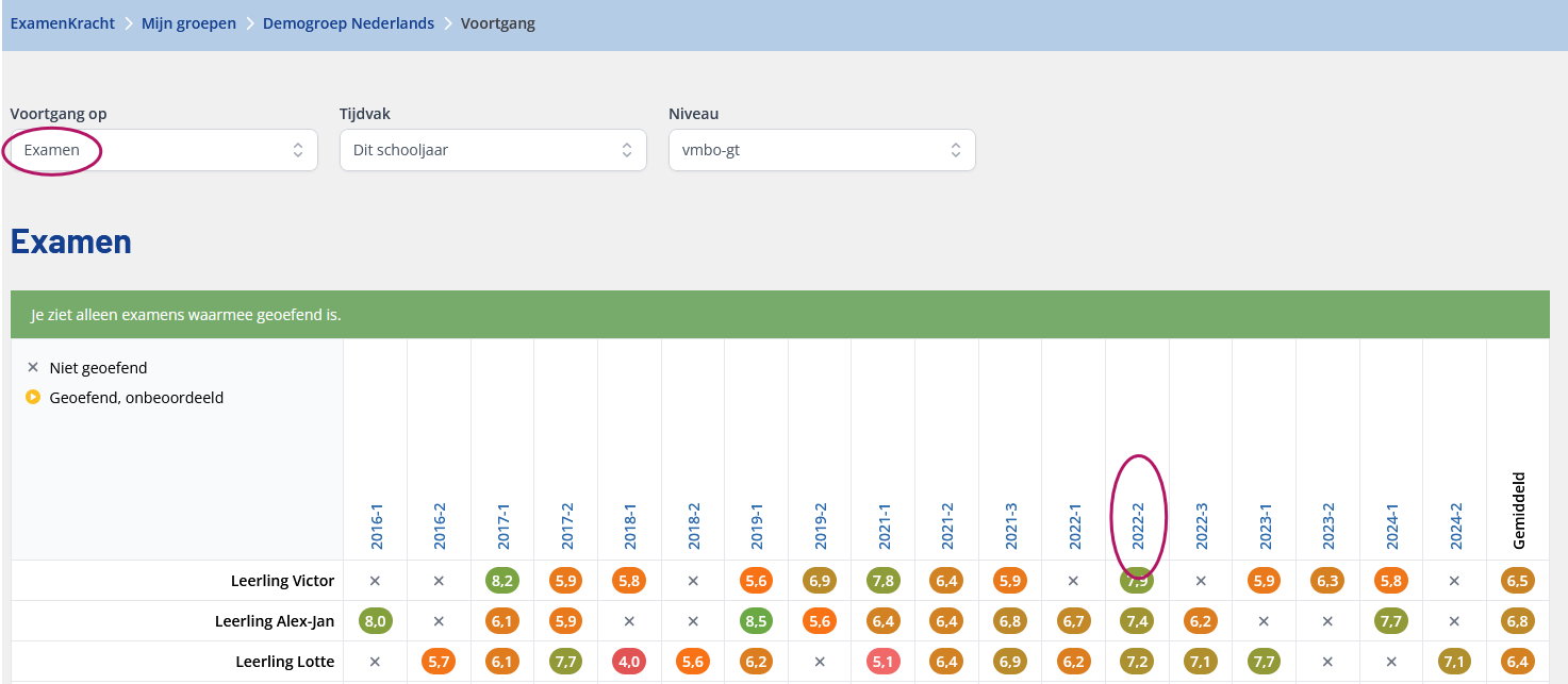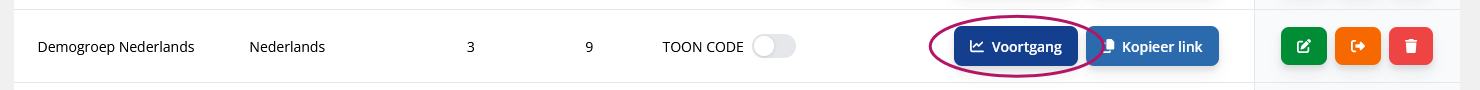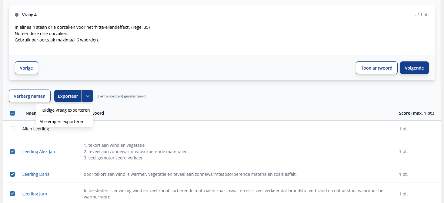 Je kunt de antwoorden van leerlingen op examenvragen exporteren, zodat je ze bijvoorbeeld klassikaal kunt bespreken en leerlingen kunt laten reflecteren op waarom een antwoord wel of juist niet goed is. Dit kan vanuit een examen, maar ook vanuit een taak. Antwoorden exporteren vanuit een examen1. Ga naar de algemene voortgang van de betreffende groep. 2. Filter op "examen" en kies het betreffende examen uit de bovenste rij van de tabel. 3. Onder elke vraag verschijnen nu de gegeven antwoorden. Je kunt kiezen om de namen te verbergen of te tonen. Vink de gewenste namen aan.4. Kies bij de blauwe Exporteer knop "Huidige vraag exporteren" of "Alle vragen exporteren". Bij "Alle vragen exporteren" worden de antwoorden op alle vragen uit het examen geëxporteerd. 5. De antwoorden verschijnen in een Excel bestand in je downloads map. Bij de keuze om alle vragen te exporteren, wordt elke vraag in een aparte tabblad gezet. Je kunt nu vanuit het Excel bestand naar wens knippen, plakken en bewerken. Antwoorden exporteren vanuit een taak1. Ga naar de overzichtspagina Mijn taken en kies de voortgang van de betreffende taak. 2. Filter op "vragen" en klik op de oranje knop Bekijk alle antwoorden, of navigeer direct naar een bepaalde vraag via de bovenste rij van de tabel. 3. Volg stap 3 t/m 5 van de instructie hierboven.