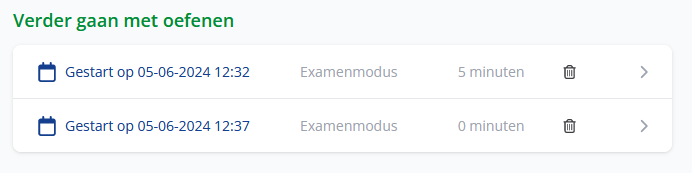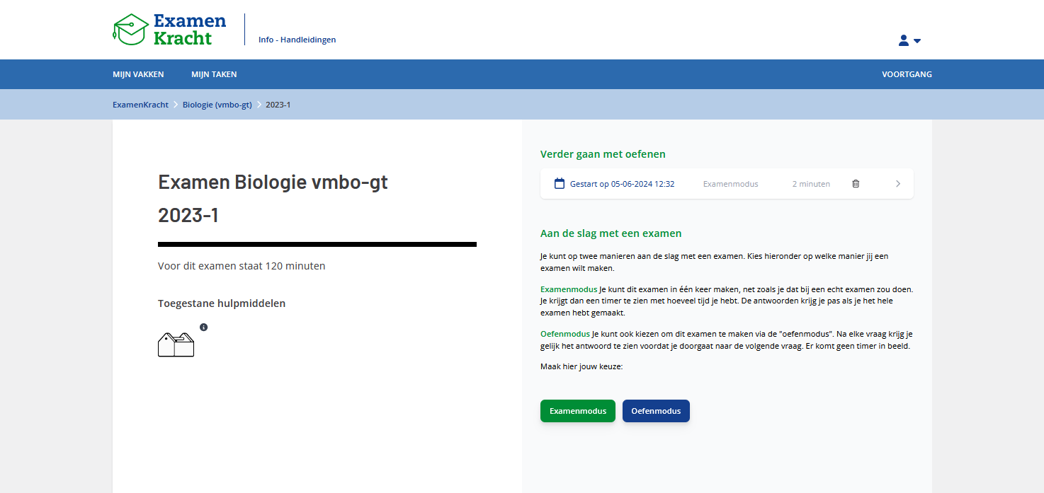 Open je het examen via de knop Examenmodus of Oefenmodus, dan zal er een nieuwe sessie worden gestart.