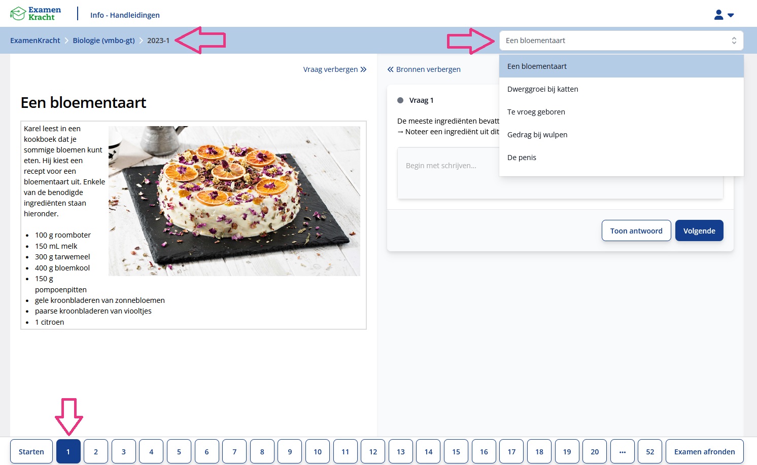 Wanneer je een examen opent, krijg je eerst het voorblad te zien. Deze bevat informatie over het examen: hoeveel tijd er officieel voor staat en welke hulpmiddelen zijn toegestaan. Ook zie je een melding als je al eerder dit examen bent gestart. Door op het pijltje te klikken, ga je verder waar je gebleven was.