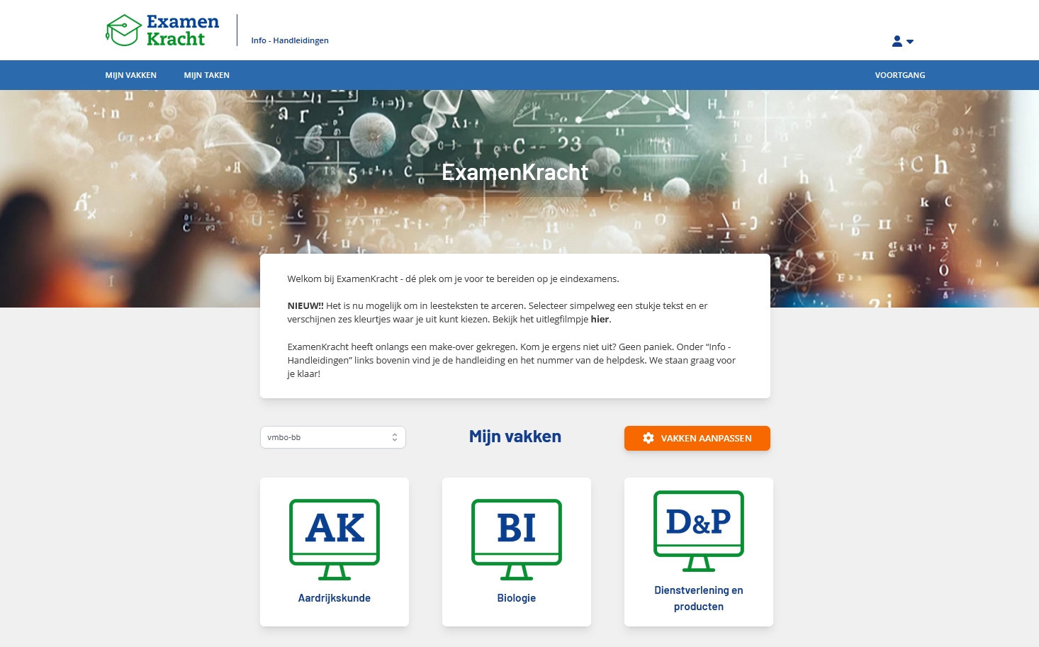 De pagina Mijn Vakken is de homepage. Hier zie je een overzicht van al de door jouw gekozen vakken en niveaus.