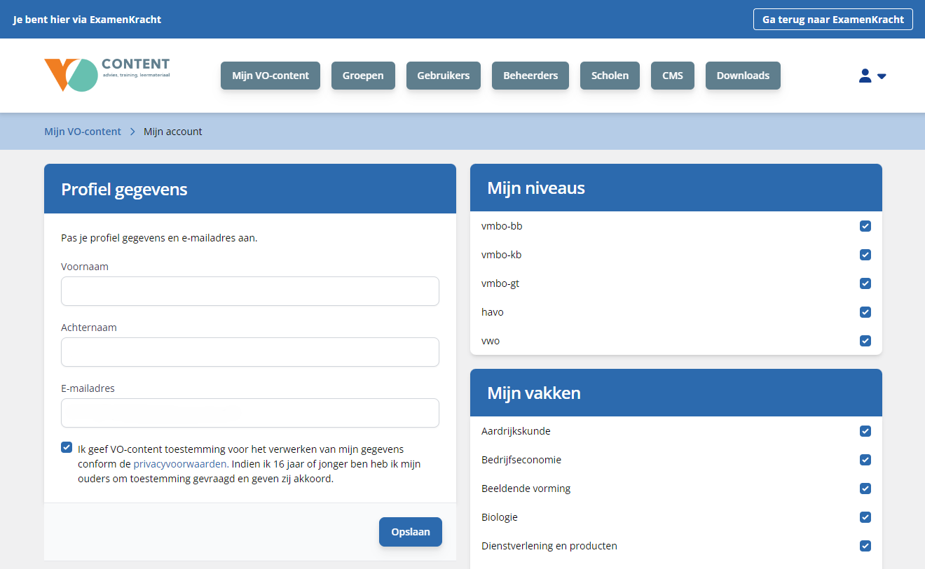Via de drop-down menu links wissel je makkelijk van niveau. Vakken pas je aan via de oranje knop. Let op: Je wordt dan uit ExamenKracht geleid naar de "Mijn VO-content" omgeving. Dit is jouw profielpagina waarmee je je toegang regelt voor alle programma's van VO-content. De vakken en niveaus die je hier aan- of uitvinkt, worden dus ook aangepast voor de SterMonitor en andere Extra programma's van VO-content. Via de knop rechts bovenin ga je weer terug naar ExamenKracht (of gebruik het pijltje terug in je browser).