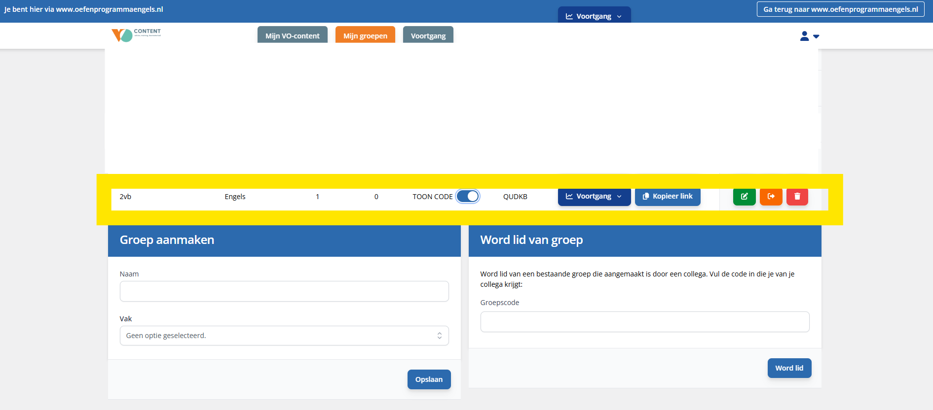 Groepen aanmaken In Mijn VO-content vind je bovenin de grijze knop ‘Mijn groepen’: Voeg als docent een groep toe. Geef de groep een naam en koppel deze aan een vak. Deel de code van de groep met je leerlingen (bijvoorbeeld F6HDZ).