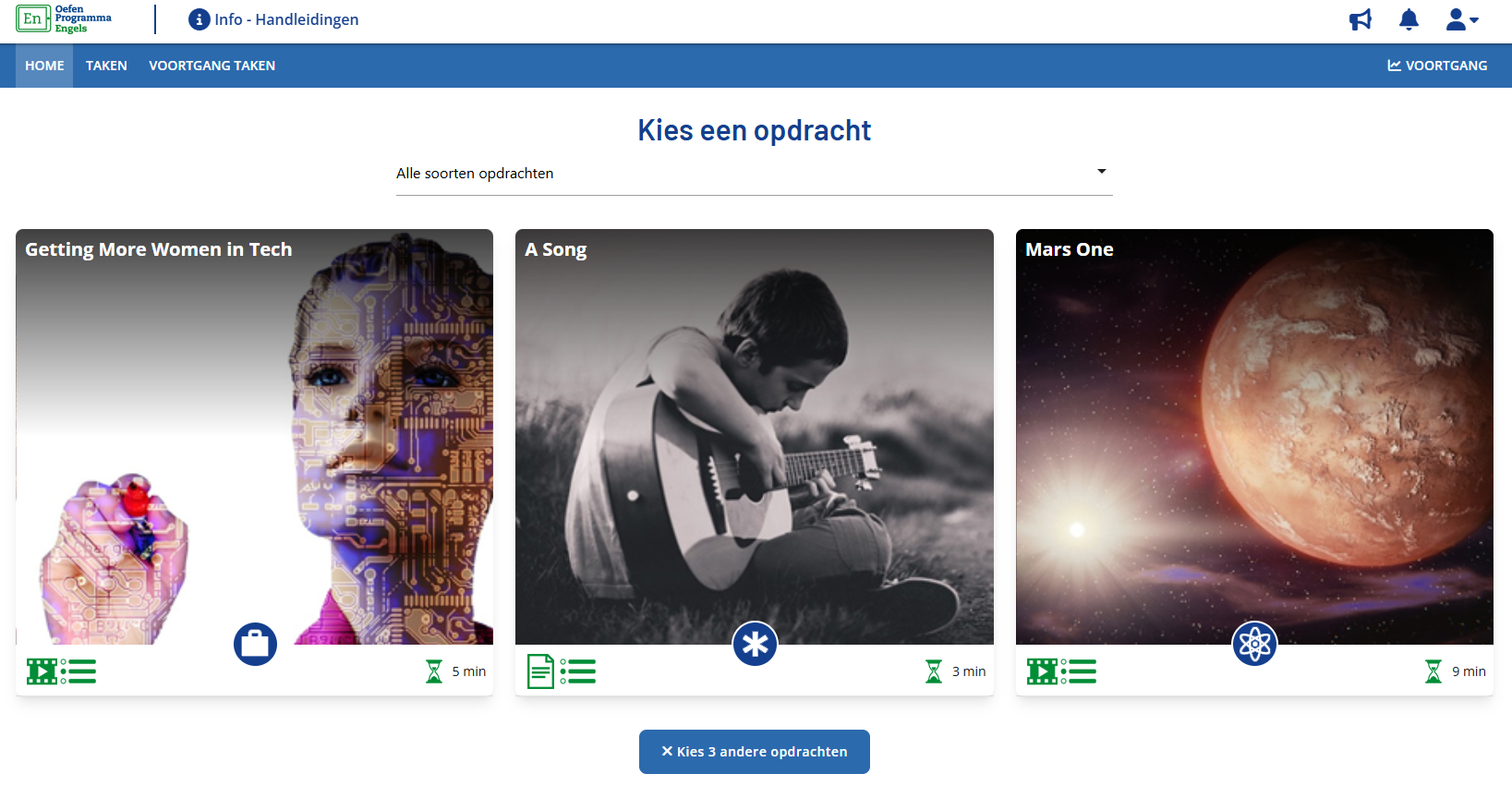 Met Oefenprogramma Engels gaan leerlingen zelfstandig aan de slag om hun lees- en luistervaardigheid in het Engels te verbeteren. Vanwege de insteek van het programma dat leerlingen er zelfstandig mee kunnen werken, is een bepaalde basisvaardigheid in het Engels vereist. Het programma bevat ongeveer 900 lees-, luister- en kijkopdrachten. Deze opdrachten verschillen van niveau, maar ook van onderwerp en tijdsduur. Iedere opdracht bestaat uit een bron (een leestekst, luisterfragment of video) waar vragen over worden gesteld. Het niveauverschil wordt bepaald door de moeilijkheid van de bron, de moeilijkheid van de vragen en de keuze van vraagtypen.Let op: In schooljaar 2024/2025 is een deel van de opdrachten vernieuwd en verbeterd. Een groot deel is hierin nog niet meegenomen. Wat er in deze handleiding staat geldt dus niet voor alle opdrachten.